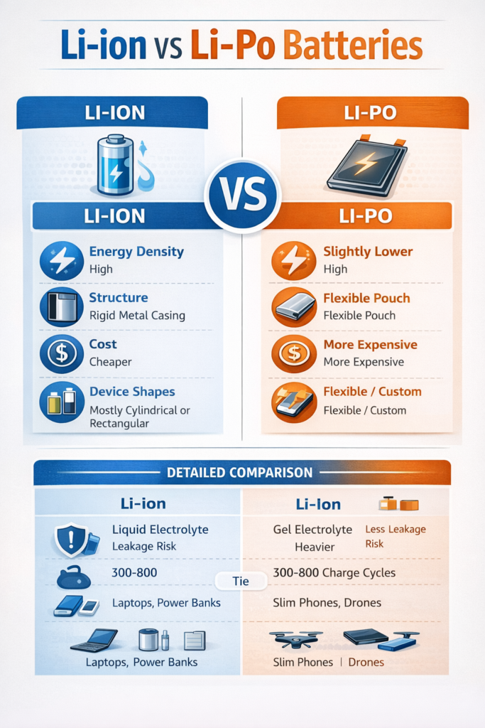 If you’ve ever checked smartphone specs, power banks, drones, or laptops, you’ve likely seen Li-ion or Li-Po batteries mentioned. But what exactly is the difference between them? And which one is better?