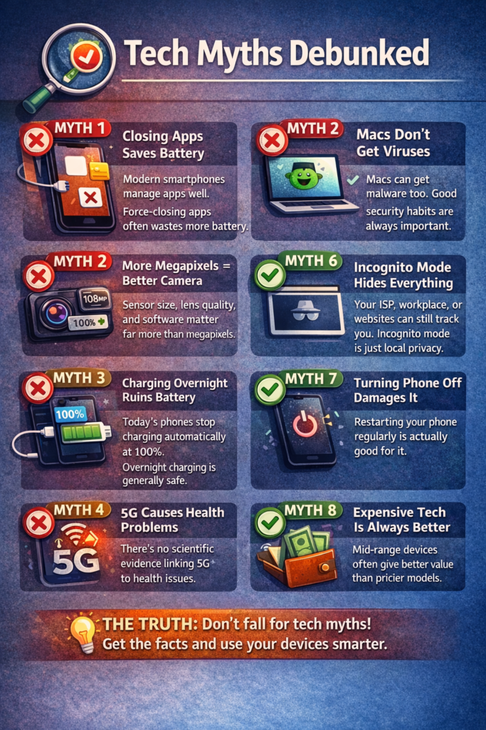 Technology evolves fast—but unfortunately, tech myths spread even faster. From smartphones to laptops and the internet, many people still believe outdated or completely false ideas that can lead to poor decisions, wasted money, or unnecessary fear.