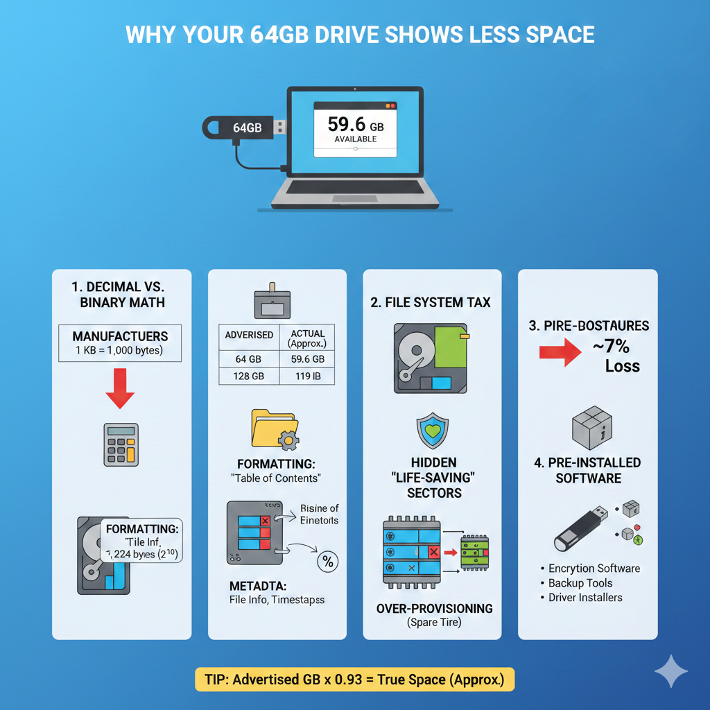 You’re not being cheated by the laws of mathematics and how flash memory works. The advertised capacity is technically correct (in decimal bytes), but what your computer shows is measured differently and reduced by necessary reserved areas.